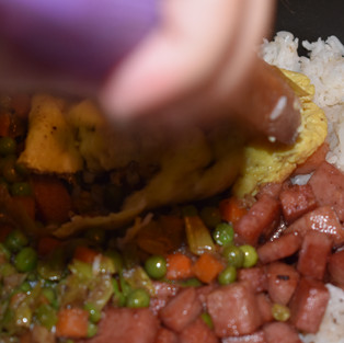 5. As the liquid from the carrots and peas evaporates, place the rice, your protein of choice(spam and eggs) into the pot and saute all the ingredients together.