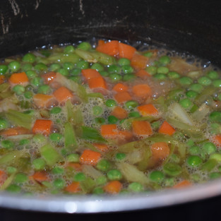 4. Saute the carrots and peas with the wet ingredients and a cup of 1/2 cup of beer (which is optional), incorporate 1 Tbs of Kikkoman Soy Sauce, and add 1/2 tsp Garlic powder togehter with1/2 tsp black pepper and a dash of salt.